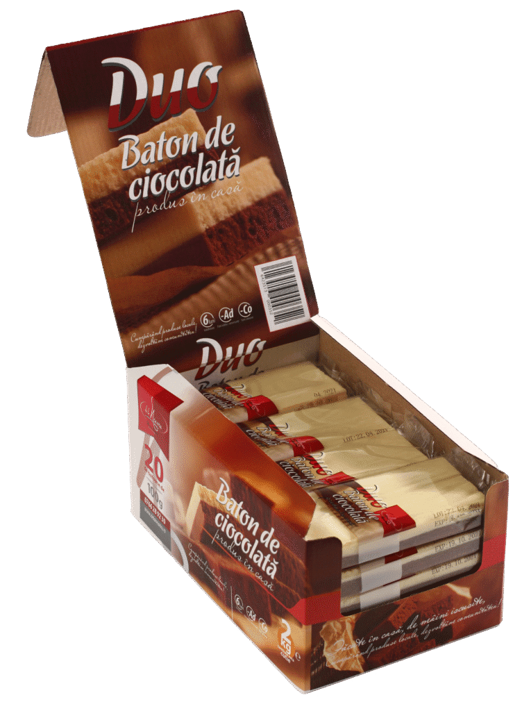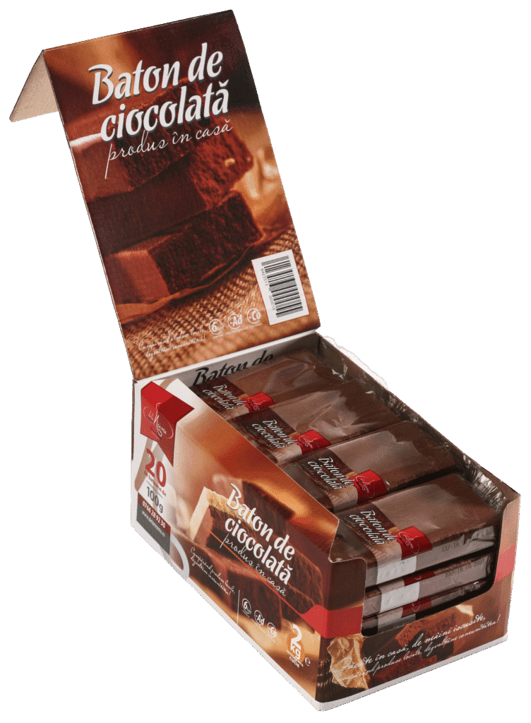 Batoanele de ciocolată de casă sunt ambalate în cutii de carton ce conţin 20 de batoane de 100 g ambalate individual.