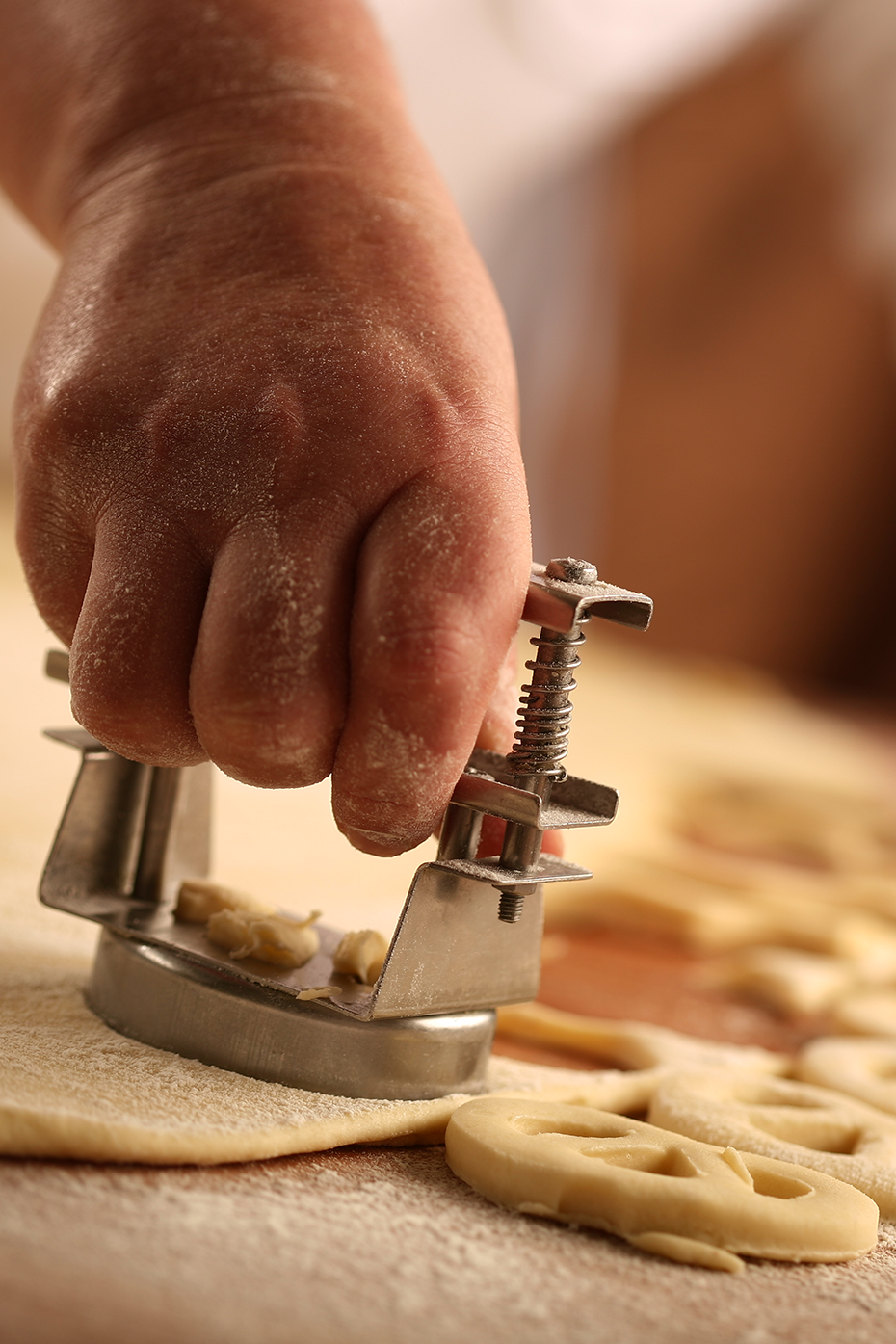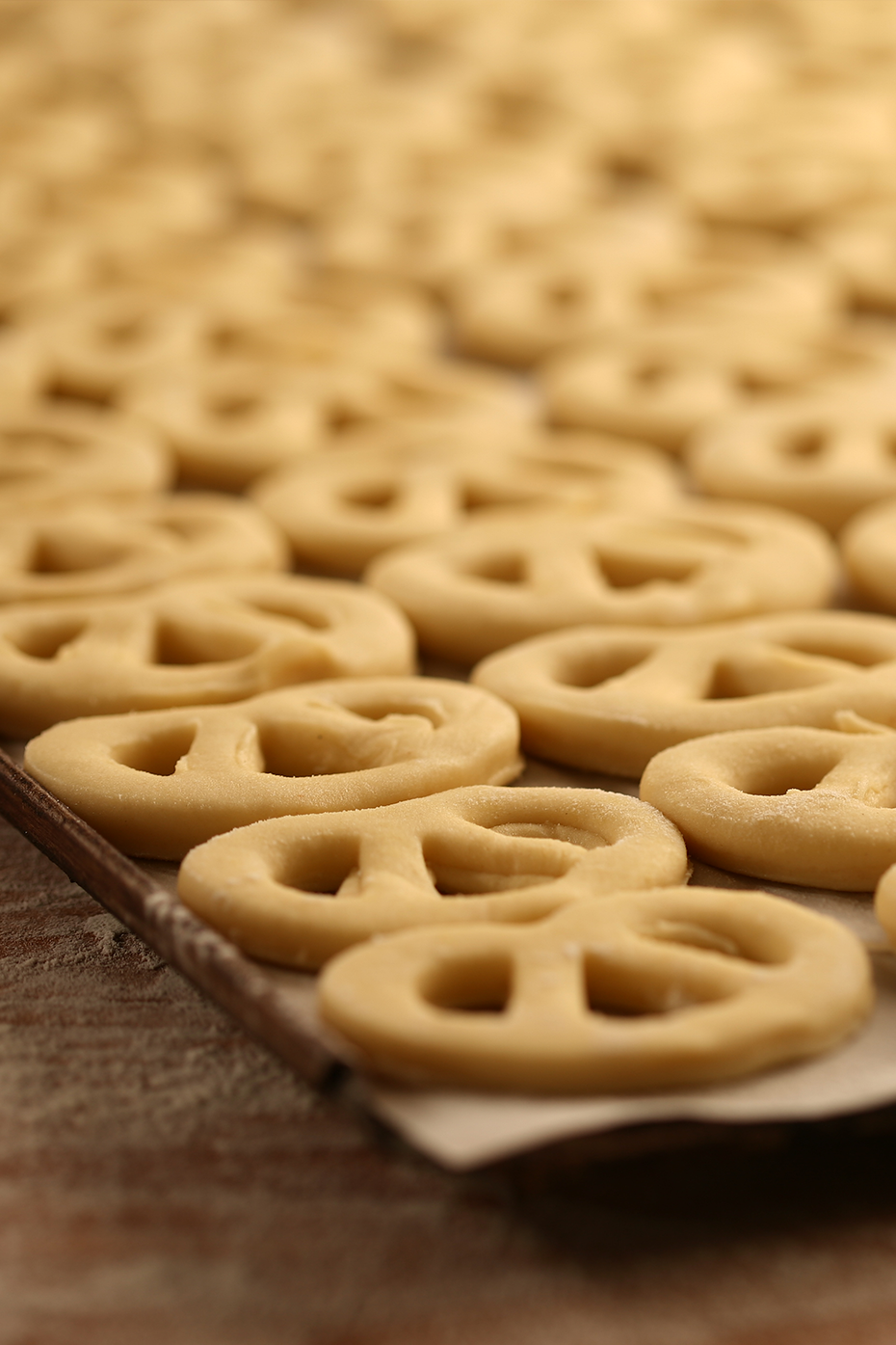 The pretzel dough is rolled out on a wooden board and cut into their classic shape, with the same care as in the kitchens of yesteryear. Each piece is placed on trays, brushed with egg for gloss, and patiently placed in the oven.