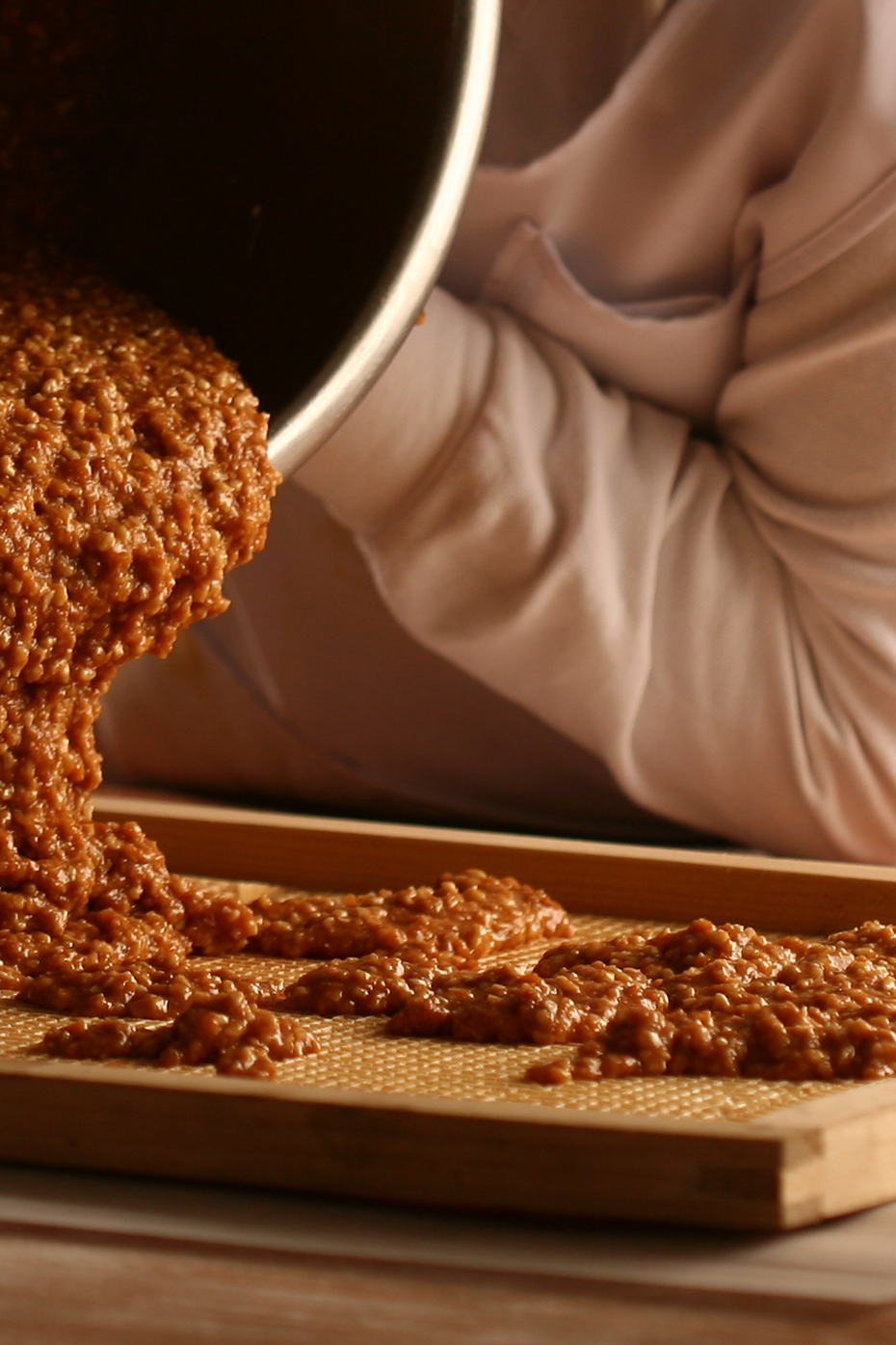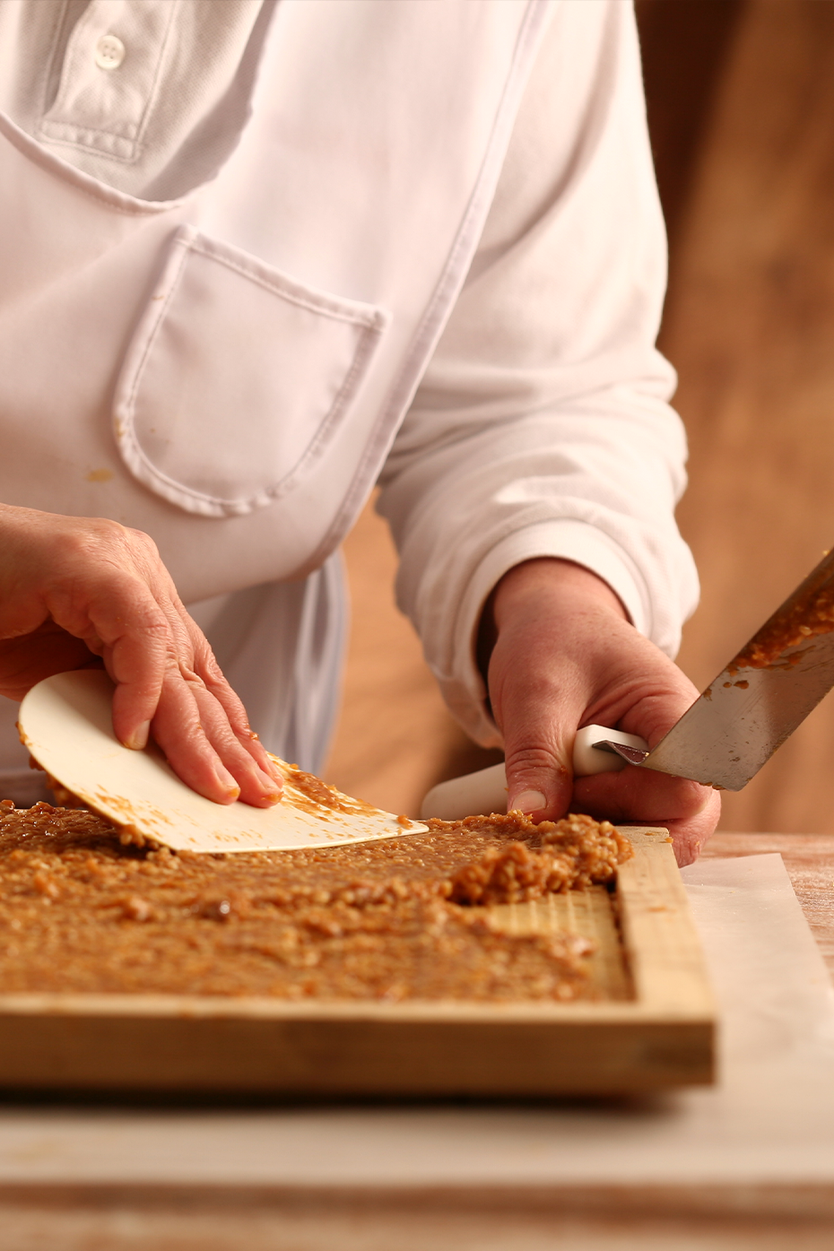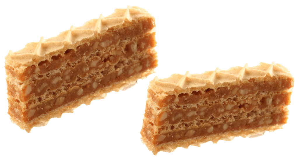The lattice takes shape in our hands, layer by layer. The caramel cream is carefully prepared, then poured over wafer sheets, along with roasted peanuts or hazelnuts. This continues until rich layers are obtained, and finally the dessert is covered with wafer sheets and left to cool.